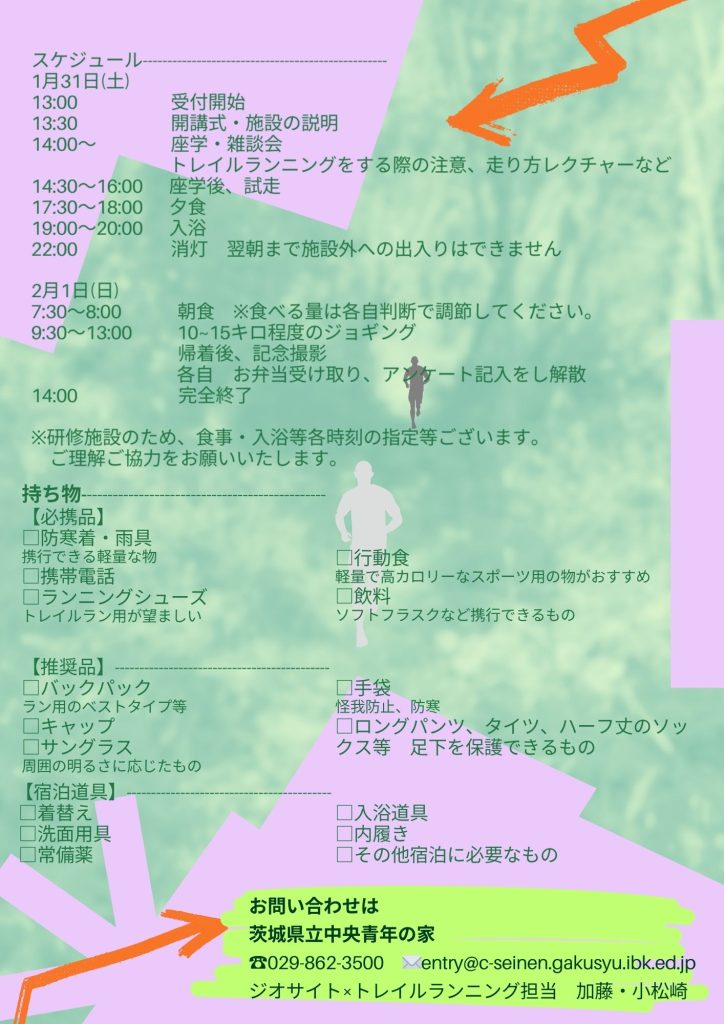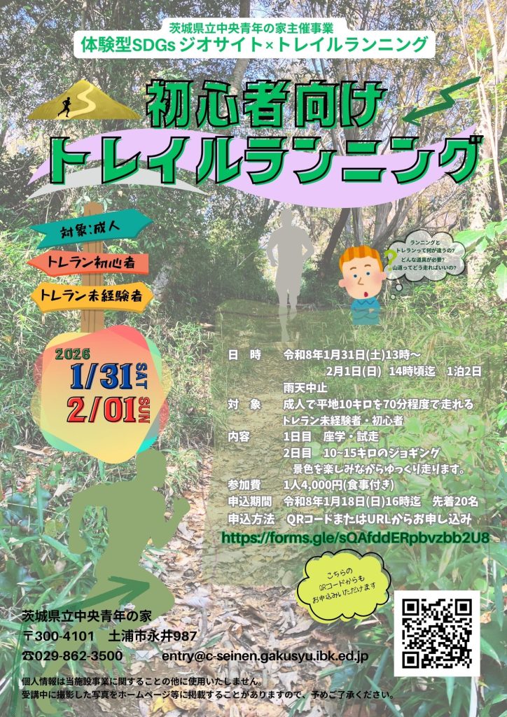 対 象:成人 (平地10kmを70分程度で走れるトレラン未経験者・初心者) 定 員:先着20名 参加費:4,000円 (施設使用料・食事代・保険代含む) ■申込み方法 下記の申込みフォームへ必要事項をご記入ください URL:https://forms.gle/sQAfddERpbvzbb2U8 ※その他詳細はチラシをご参照下さい。